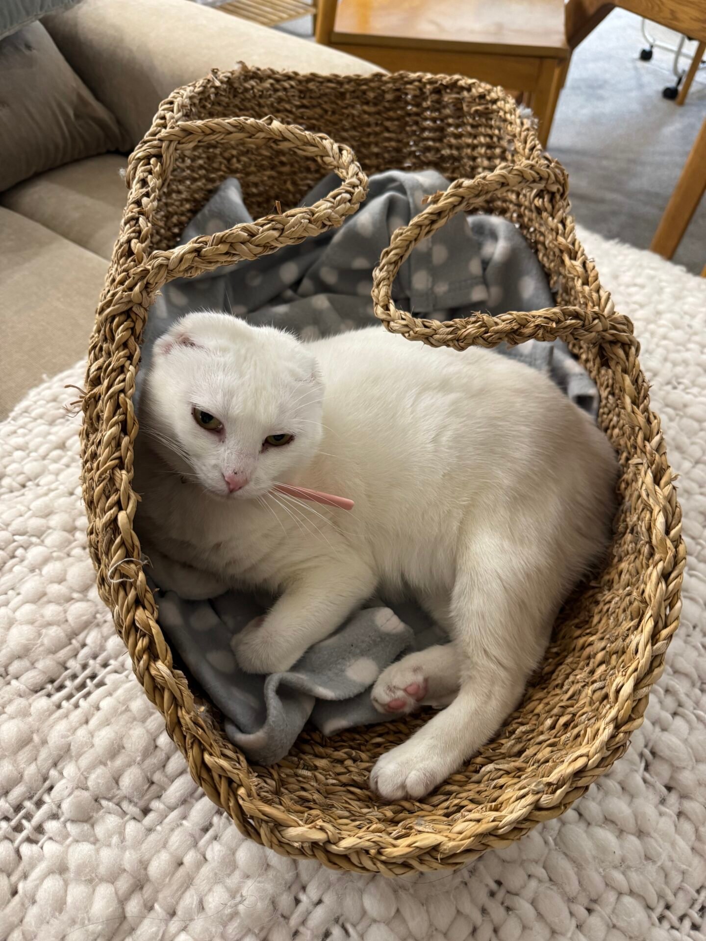 This is Bella! Bella was rescued while living under a house in Auckland. I found her at a rescue at 2 year old with three tiny kittens. She is pure white and her ears were sunburnt and damaged so I took her and her babies home to foster. Her kittens were found homes in time and I had Bella desexed and had her ears removed to prevent the lesions becoming cancerous. Thankfully we were just in time. Her hearing is perfect it just the pinna that is gone. She looks like a white seal!