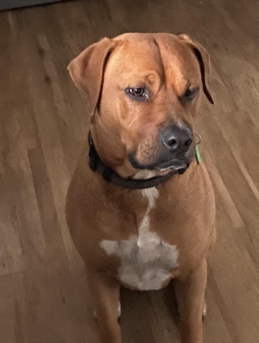 Max is a 9-year-old neutered male with a gentle, easygoing nature and a slightly goofy personality. We think he is a ridgeback/labrador mix.