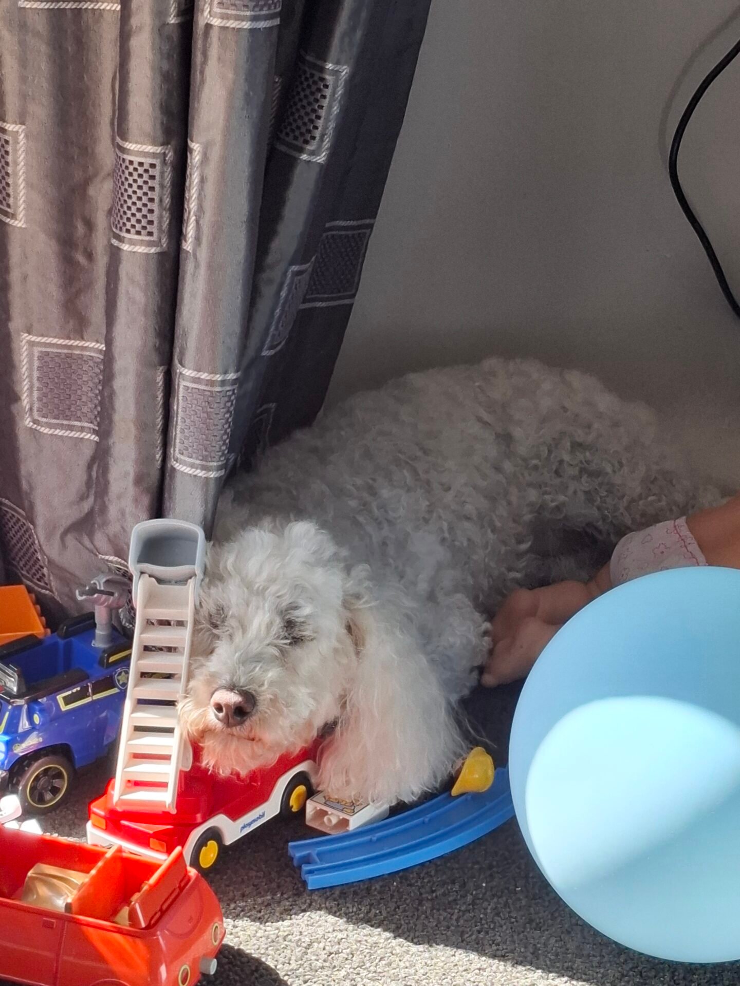 She is a very intelligent dog, but that also can lead to her being a bit of a chaos queen. She loves to help herself when she thinks you aren’t looking. Will find herself a bed in any spot whether thats on your favourite blanket or a stack of toddler toys. Her intelligence doesn’t extend to utilizing a doghouse (as seen in photo).