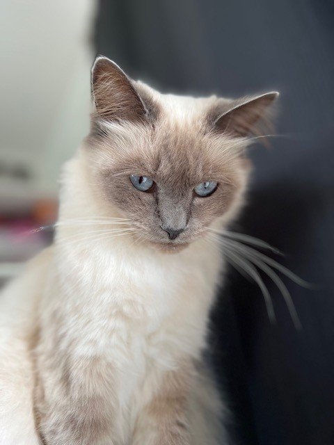Sienna – she’s a ragdoll. So very beautiful with long fluffy white hair. She’s a real diva, think she runs the show. She’s very vocal and will tell you when it’s time to feed her. She likes to sleep at the foot of your bed and will sometimes grace you with a snuggle on your lap in the evening. She loves scratches and loves to be brushed. She loves her dry food daily and enjoys a wet food treat from time to time. She loves to play inside shopping bags. She is desexed and micro chipped. She is 7 years old.